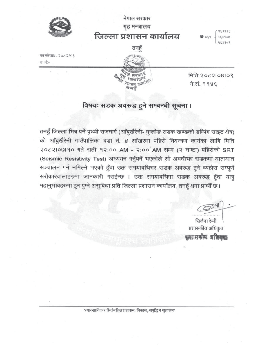 तनहुँ । पृथ्वीराजमार्ग अन्तर्गत तनहुँको आँबुखैरेनी-मुग्लिन सडकखण्ड आज (सोमबार) राति दुई घण्टा पूर्ण रूपमा बन्द हुने भएको छ । आँबुखैरेनी गाउँपालिका-४ साँखरमा भूकम्प प्रतिरोधकता परीक्षणका लागि राति १२ बजेदेखि दुई बजेसम्म सडकखण्ड पूर्ण रूपमा बन्द हुने जिल्ला प्रशासन कार्यालय तनहुँले जनाएको छ ।
