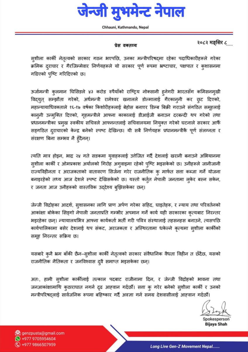 जेन्जी मुभमेन्ट नेपालले आज (सोमबार) प्रेस विज्ञप्ति जारी गर्दै ऊर्जामन्त्री कुलमान घिसिङले भारतसँग गरेको विद्युत् सम्झौताबाट ४३ करोड रुपैयाँ बराबरको आर्थिक नोक्सानी भएको, अर्थमन्त्री रामेश्वर खनालले डोल्मा नामक कम्पनीलाई गैरकानुनी कर छुट दिएको, महान्यायाधिवक्ता सबिता भण्डारीले १६-१७ वर्षका किशोरीहरुको डिम्ब बिक्री गराउने संगठित समूहलाई कानुनी उन्मुक्ति दिएको, गृहमन्त्री ओमप्रकाश अर्यालले आफ्ना काकालाई सशस्त्र प्रहरीको डीआईजी बनाउन दरबन्दी थपेको र प्रधानमन्त्रीका प्रमुख स्वकीय सचिव आदर्शकुमार श्रेष्ठले आफन्तलाई सचिवालयमा नियुक्त गरेको आरोप लगाएको छ।