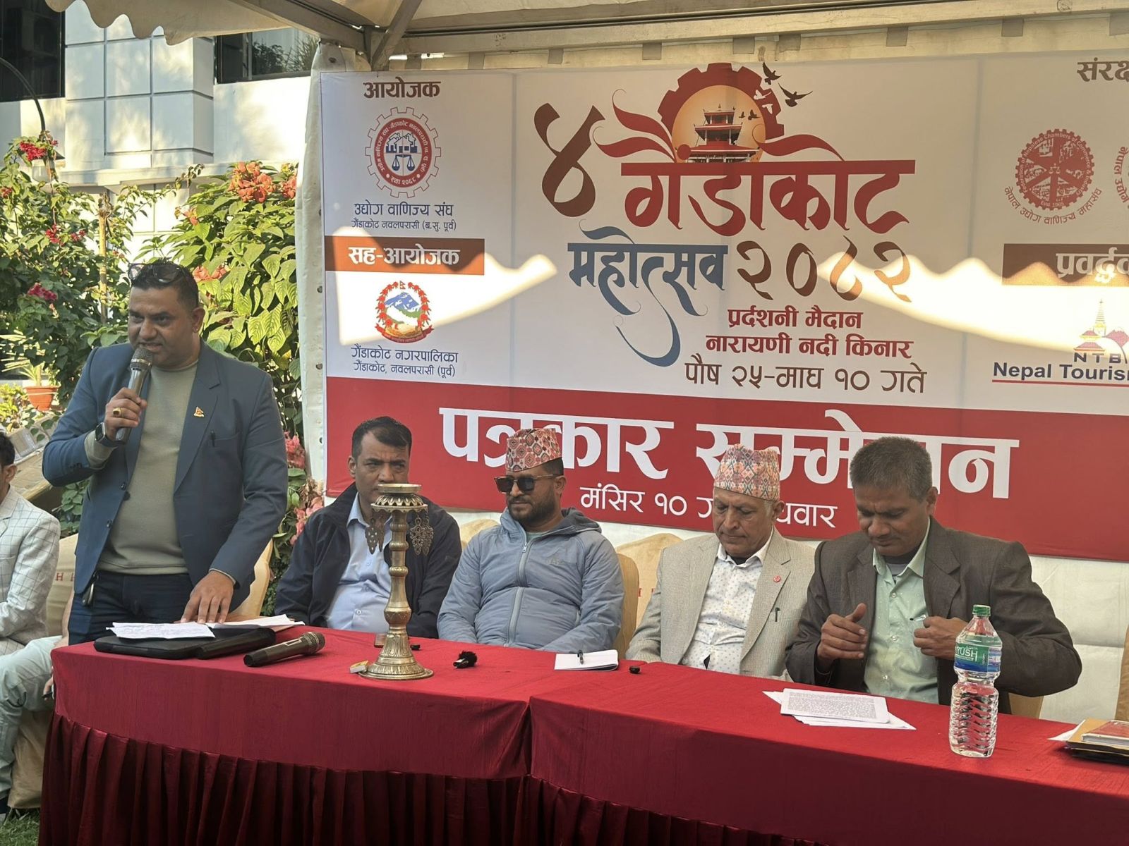 गैँडाकोट। चौथो गैँडाकोट महोत्सव पुस २५ गते देखि माघ १० सम्म सुरु हुने भएको छ। उद्योग वाणिज्य संघ गैँडाकोटले आज पत्रकार सम्मेलन गरी नारायणी नदी किनारमा आयोजना हुन लागेको महोत्सवको बारेमा जानकारी दिएको हो । संघका अनुसार महोत्सवले स्थानीय उद्योग, व्यापार, कृषि, पर्यटन र संस्कृतिको प्रवद्र्धनमा महत्वपूर्ण भूमिका खेल्ने अपेक्षा गरिएको छ।