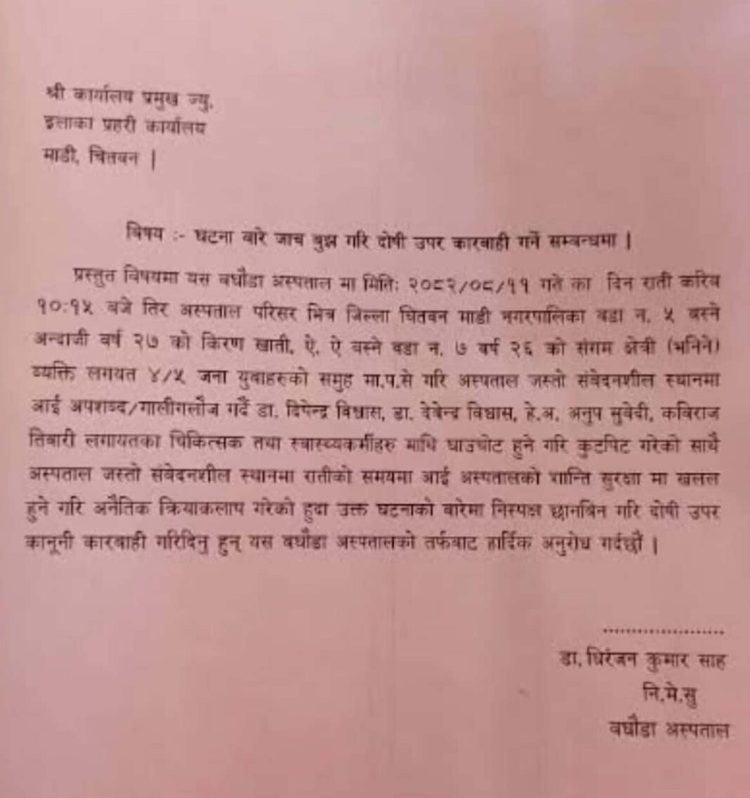 चितवन । माडीको बसन्तपुरस्थित बघौंडा अस्पतालमा बिहीबार राति चिकित्सकमाथि भएको कुटपिट घटनाप्रति अस्पताल प्रशासनले गम्भीर ध्यानाकर्षण गराउँदै दोषीमाथि कडा कानूनी कारबाहीको माग गरेको छ ।