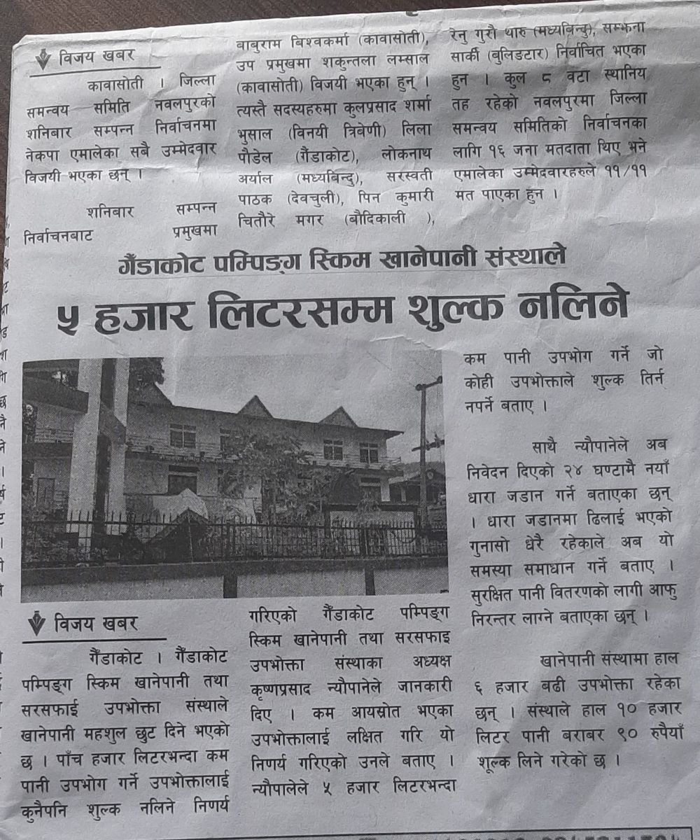 वि.सं. २०७९ जेठ २९ गते गठन भएको कृष्णप्रसाद न्यौपाने नेतृत्वको खानेपानी संस्थाले केहीसमय यता पूर्वाधार विकासका साथै, प्रशासनिक सुधार र नीतिगत सुधारमा काम गरिरहेको छ ।