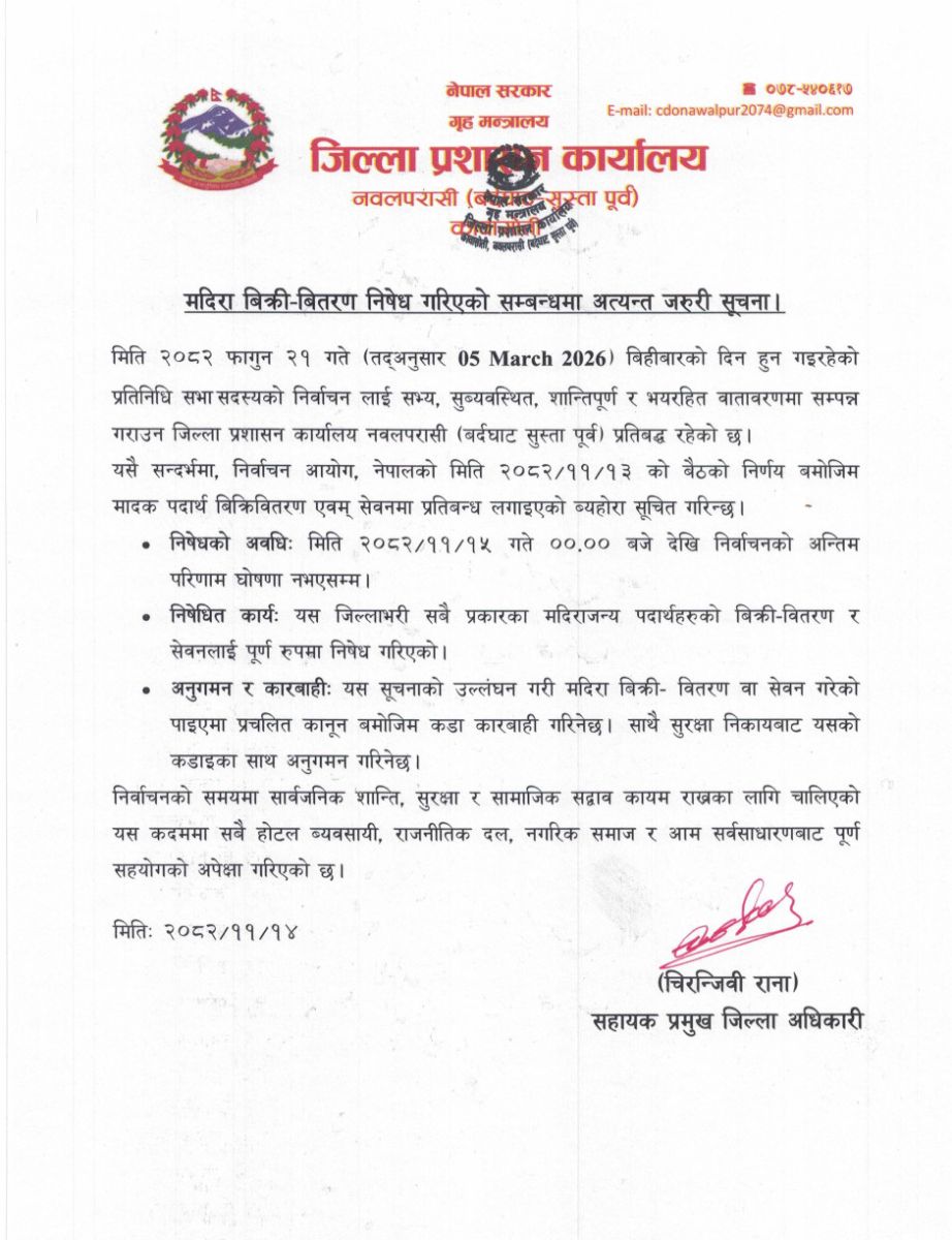 नवलपुर । फागुन २१ गते हुने प्रतिनिधिसभा सदस्य निर्वाचनलाई लक्षित गर्दै नवलपरासी (बर्दघाट सुस्ता पूर्व) मा मदिरा बिक्री-वितरण तथा मदिरा सेवन पूर्ण रूपमा निषेध गरिएको छ । जिल्ला प्रशासन कार्यालय नवलपरासी (बर्दघाट सुस्ता पूर्व) ले निर्वाचनलाई स्वच्छ, निष्पक्ष तथा भयरहित वातावरणमा शान्तिपूर्ण रूपमा सम्पन्न गराउने उद्देश्यसहित उक्त आदेश जारी गरेको हो ।