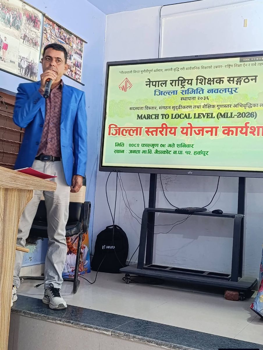 गैंडाकोट । नेपाल राष्ट्रिय शिक्षक संगठन नवलपुरको आयोजनामा भएको एकदिने जिल्ला स्तरीय योजना कार्यशाला गोष्ठी शनिबार जनता मा. वि हर्कपुरमा सम्पन्न भएको छ । जिल्ला संगठनको अध्यक्ष टिकाराम डुम्रेको अध्यक्षता र संगठनका गण्डकी प्रदेशका उपाध्यक्ष बलराम रानाभाटको प्रमुख आतिथ्यतामा भएको सो कार्यशालामा संगठन सुदृढिकरण र संगठन बारेमा जानकारीमूलक कार्यशाला सञ्चालन गरिएको थियो ।