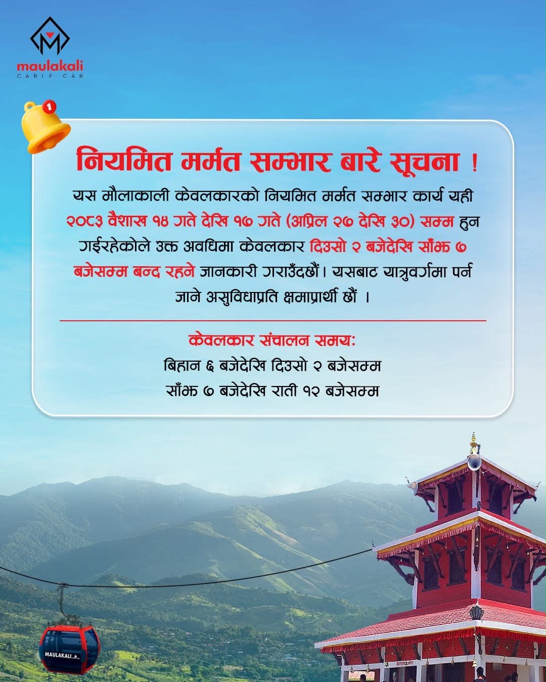 भिडियो ग्यालरी 1 (current) ताजा खबर चितवनका ३० हजार पशुचौपायलाई लम्पीस्किनविरुद्धको खोप दाउन्नेको पूर्वी खण्डमा एकतर्फी ढलानको काम अन्तिम चरणमा मौलाकाली केबलकार आजदेखि १७ गतेसम्म आशिंक रुपमा बन्द रहने तमु ह्युल छोँज धीं गुरुङ राष्ट्रिय परिषद नवलपुरको अध्यक्षमा धनबहादुर गुरुङ चयन भरतपुर–७ मा बन्ने भयो नेपाल आविष्कार केन्द्र चितवनको मेघौलीमा पहिलो पटक वन्यजन्तु पर्यटन प्रवद्र्धन गर्न ‘सफारी मार्ट’ को शुरुवात बढ्दै औलोको सङ्क्रमण